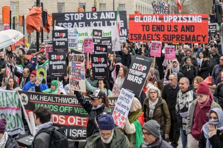 Some waved placards reading “Stop Trump’s Wars”, “Stop the War on Iran”, “Stop Arming Israel” and “No War on Iran”.